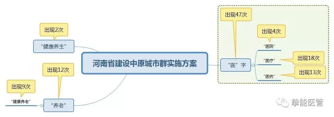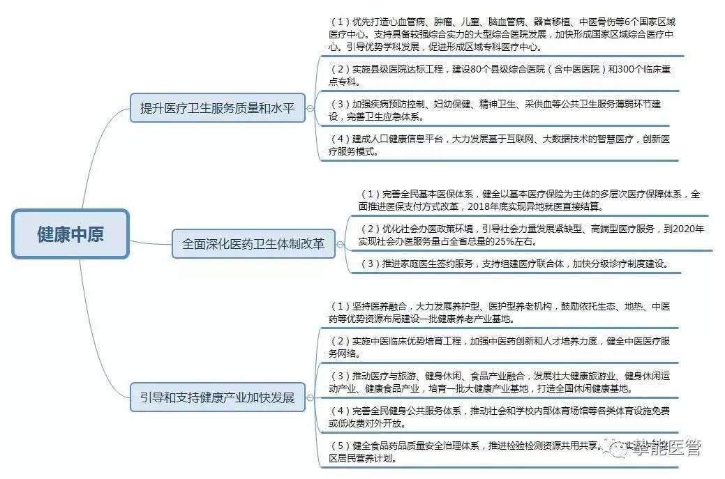 河南要在这些地区大力布局医疗产业,您准备好了吗?6月5日,河南省委、省政府印发《河南省建设中原城市群实施方案》(下称《方案》),描绘了河南未来8年的发展蓝图,值得我们一读再读。 《方案》分为正文和附件两大部分,其中正文部分又分为九大版块100多条内容,篇幅达2.5万多字。附件部分以多张图片展示了24个“中原城市群重大工程”项目,其中不乏与医疗健康产业相关的信息。 其中正文部分,“医”字出现了47次,“健康”24次,“养老”12次,“健康养生”2次……这还不包括“附件”。《方案》的重要性、指导性,不言而喻。 社会办医新方向 篇幅很长,最值得我们关注的是第七版块第二部分“健康中原”规划,不仅为社会办医指出了发展方向,而且还规划了河南2017—2025年期间的医疗蓝图,乃至每一阶段要做的事。 内容如下:
